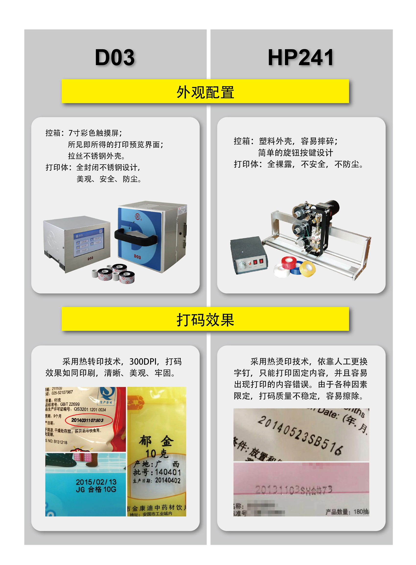 最近几年,为了保障食品、药品、生活日常用品的质量安全,国家有关部门的监管越来越严,对包装标识的要求越来越高,需要打码的内容越来越多,标识功能也更加强大。 普通的色带打码机已经满足不了新时代的打码要求,正逐渐被新的打码设备所取代。这种新的打码设备称为热转印智能打码机,其中最典型的型号就是D03。