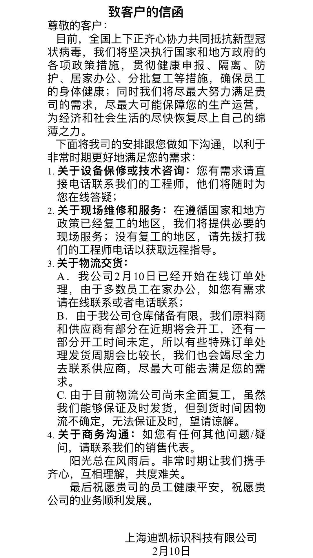 2020年2月10日,迪凯正式复工。迪凯将密切关注疫情发展,尽力安排好后续业务沟通。2020,一个极不寻常的中国年。
