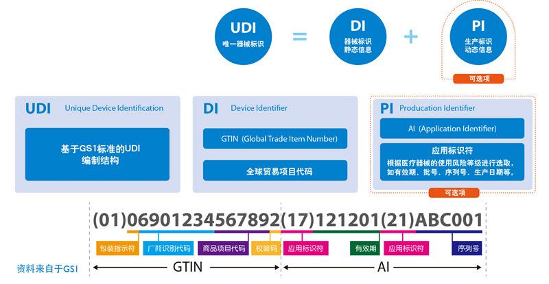 唯一器械标识(Unique Device Identification,缩写UDI)是美国FDA建立的”特殊医疗器械的识别系统”,是对医疗器械在其整个生命周期赋予的身份标识,是其在产品供应链中的唯一“身份证”。主要是一个由数字或字母组成的编码。由器械识别码(DI)和生产识别码(PI)组成。