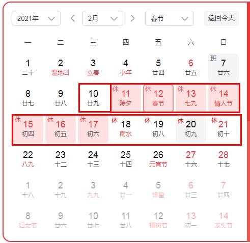2月10日(周三,农历二十九)—2月21日(周日,农历初十),放假十二天。2月7日(周日)正常上班。
